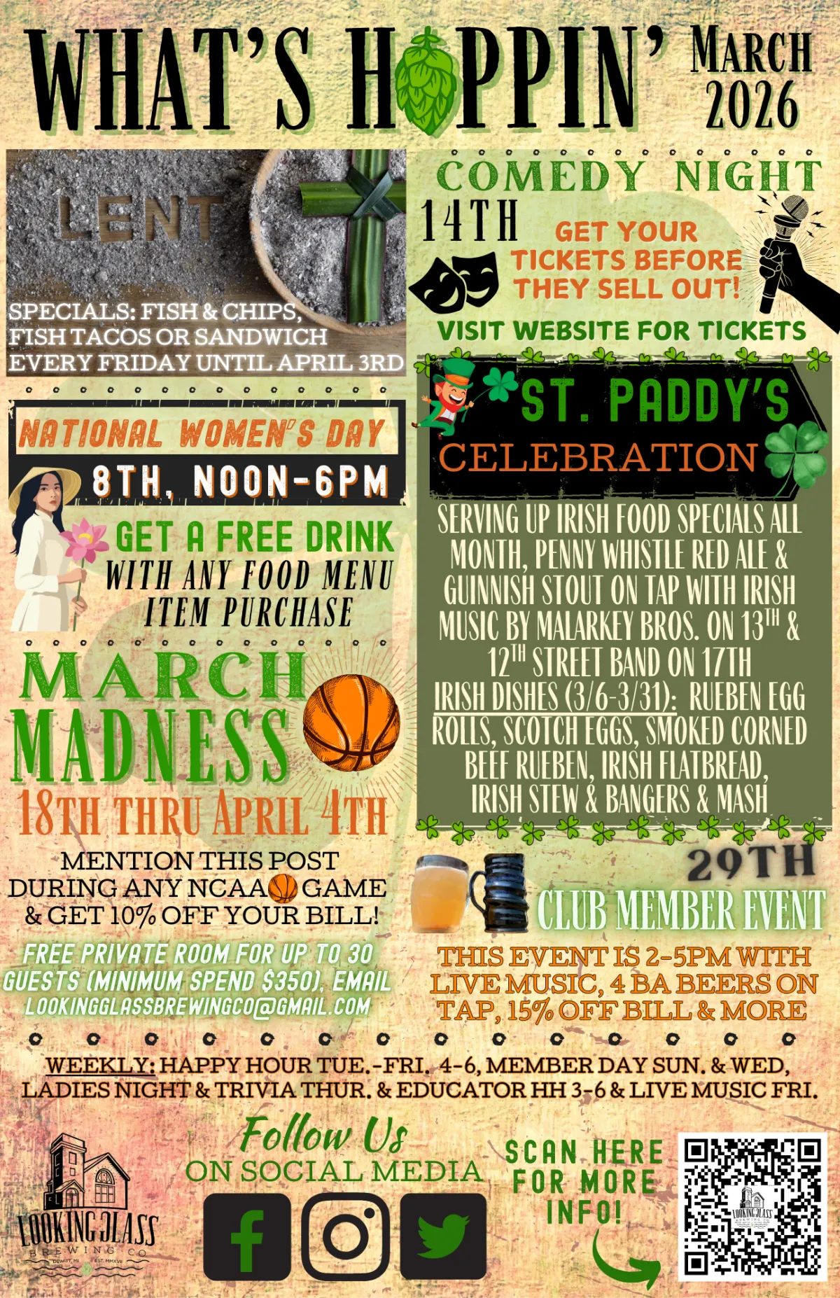 Housed in a landmark historic church in downtown DeWitt, MI, Looking Glass Brewing Co. delivers a truly unique brewery experience inspired by our stunning stained glass windows. From locally brewed craft beers and ciders to seltzers, hop water, mocktails, and wine, our beverage lineup offers something for everyone. Our acclaimed kitchen serves elevated pub fare and rotating seasonal specials, making our brewpub a must-visit destination for exceptional food, drinks, and atmosphere.